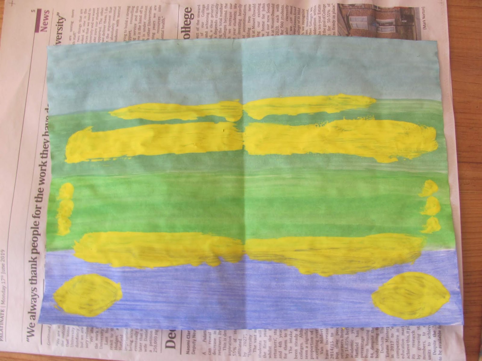 We then used thick yellow poster paint to splodge on two round shapes at either end of the purple stripe, and yellow lines between the purple and green, the blue and greeny-blue stripe, and a thick one across the middle of the greeny-blue stripe. Then three dots on either edge of the green stripe.
